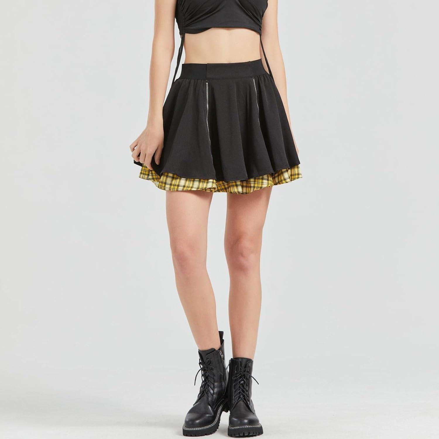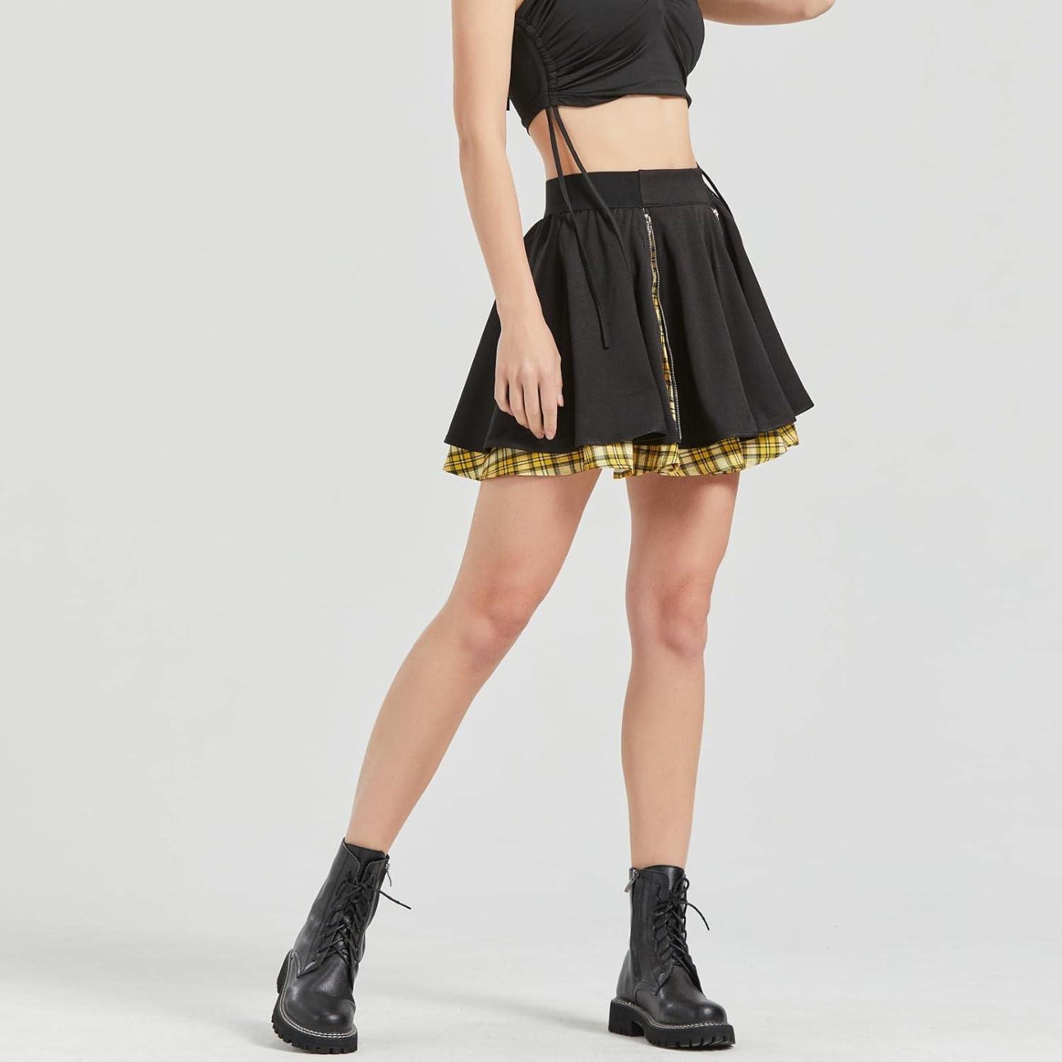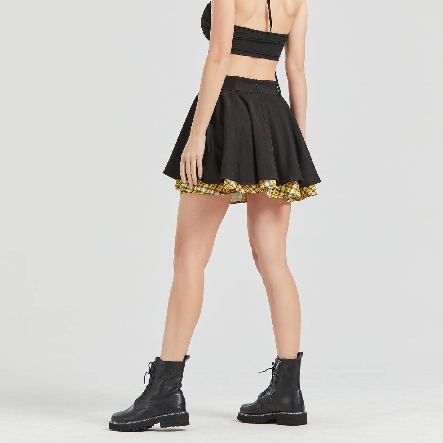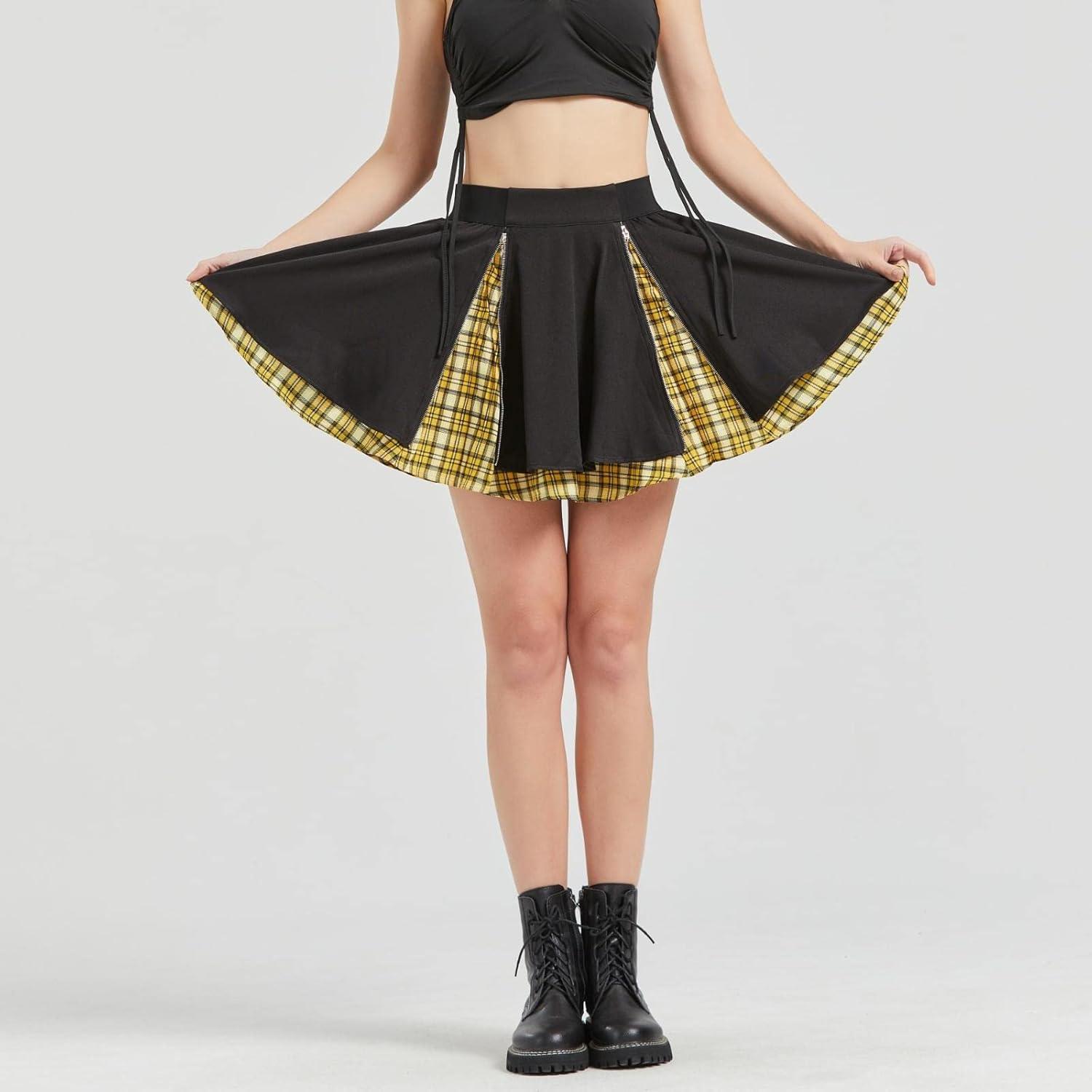 Kisidoo Gothic Skirts Cute High Elastic Waisted Plaid Kilts for Women Trendy Hem Flared Knee Length Mini Skater Skirt(A# Yellow Plaid)
